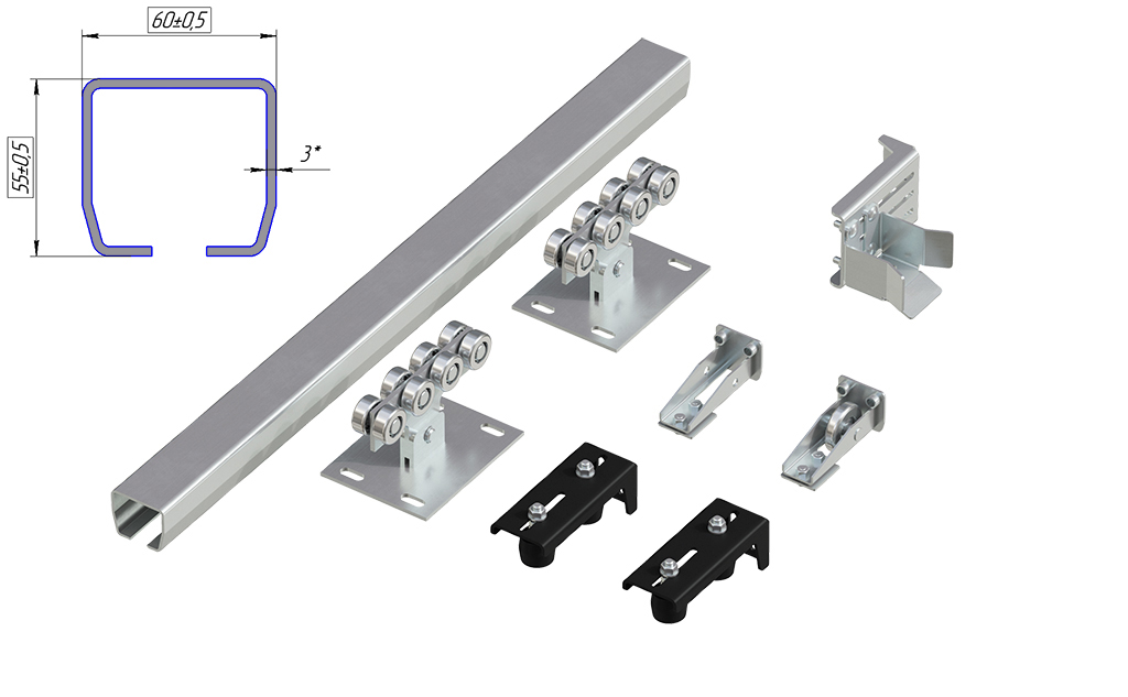 В комплект системы роликов и направляющих для балки 60х55х3 входят: